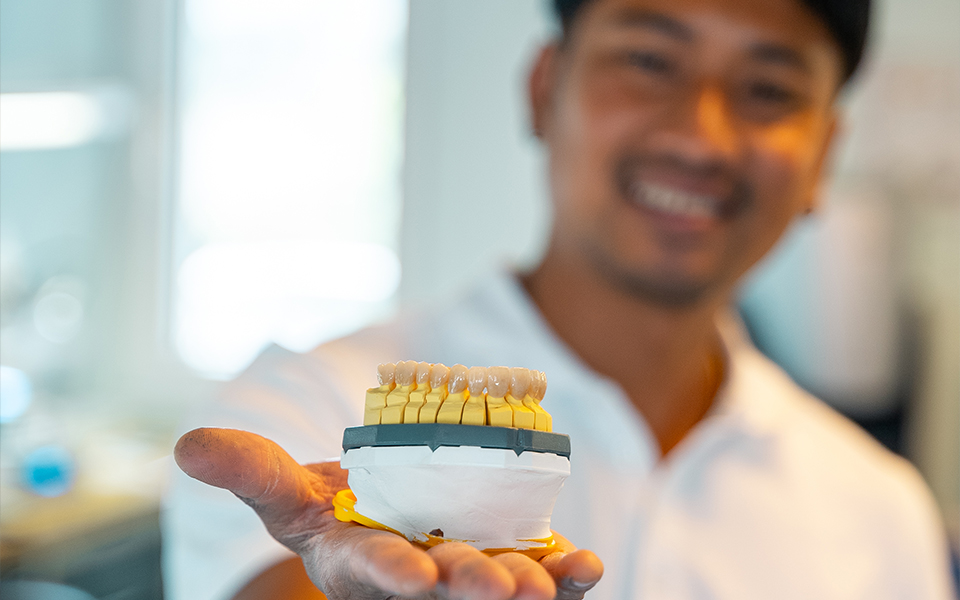 Die Anpassung von Kronen und Brücken erfolgt in unserem Dentallabor, wo sie in präziser Handarbeit hergestellt werden, um eine ideale Passform und ein natürliches Aussehen zu gewährleisten. Nach der Fertigung werden sie sorgfältig auf den vorbereiteten Zähnen befestigt. Mit der richtigen Pflege können diese zahnmedizinischen Lösungen viele Jahre lang halten und dabei helfen, Ihr Lächeln und Ihre Selbstsicherheit zu bewahren.
