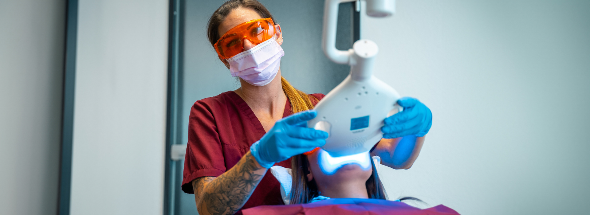 In unseren Zahnarztpraxen in Bad Säckingen & Laufenburg können wir Ihnen mittels In-Office-Bleaching in einer ca. 3 stündigen Sitzung Ihre Zähne wieder um einige Stufen aufhellen. Dazu setzen wir eine spezielle Bleaching- LED-Lampe ein, dessen Licht in Kombination zu einem hochdosierten Bleaching-Gel auf die Zähne aufgetragen wird, um entsprechende Ergebnisse zu erzielen. Dieser Vorgang kann stufenweise wiederholt werden, bis das gewünschte Ergebnis erreicht ist. Das angewandte Verfahren ist besonders schonen für das Zahnfleisch und erfolgt unter fachkundiger Aufsicht unseres speziell ausgebildeten Prophylaxe-Personals.